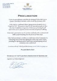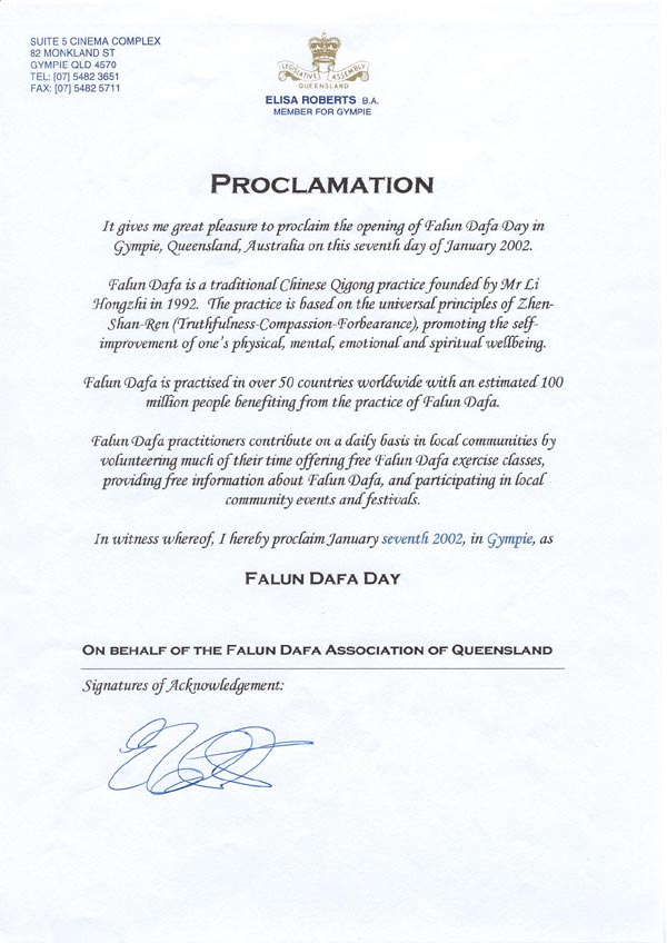 Un membre du Parlement de Queensland, en Australie proclame une journée Falun Dafa