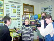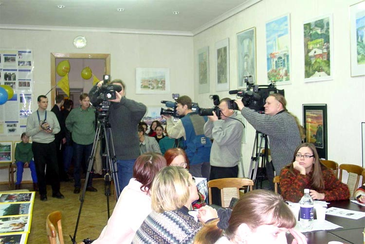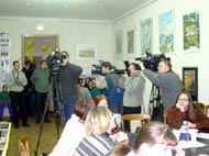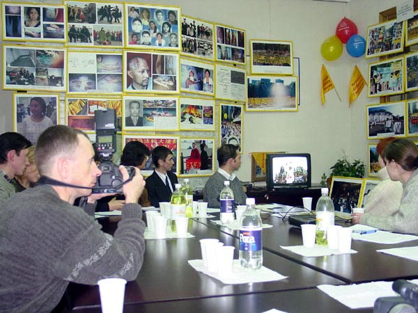 La conférence de presse lors de l'exposition photos "Le trajet de Falun Dafa" dans un hall à Kiev