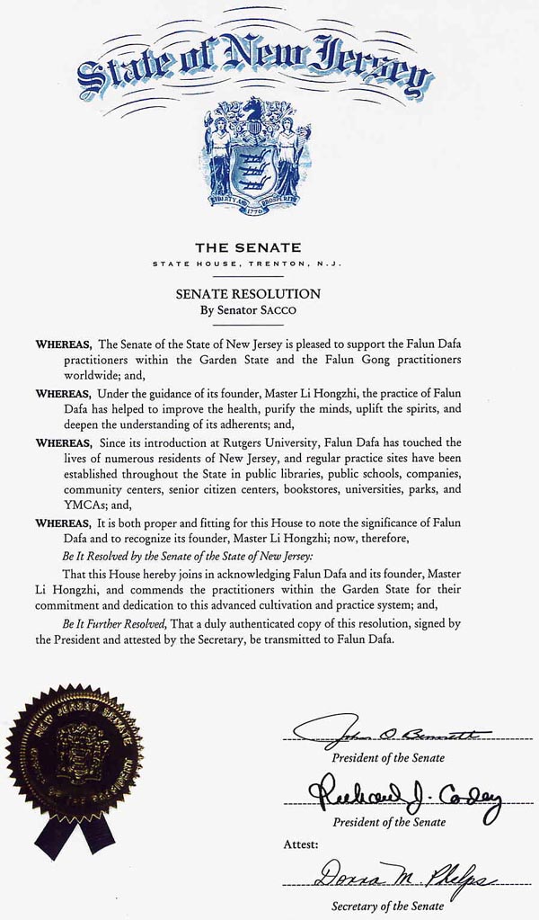 New-Jersey : Le Sénat de l'État félicite Falun Dafa et son fondateur, Maître Li Hongzhi