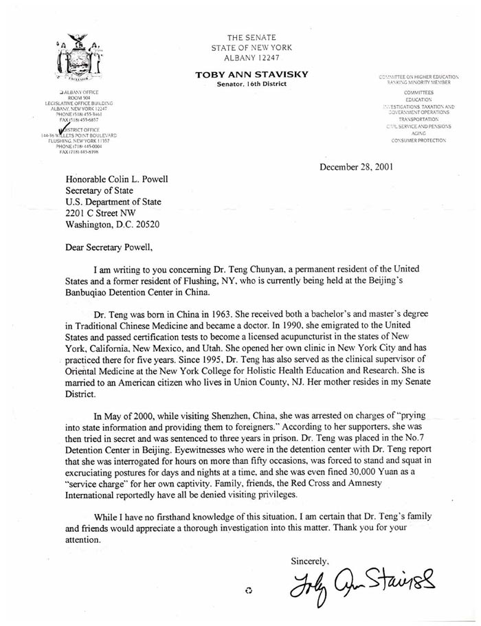 Le sénateur de l'État de New-York écrit au Secrétaire d'État pour lui demander d'ouvrir une enquête sur la condamnation de Teng Chunyan en Chine
