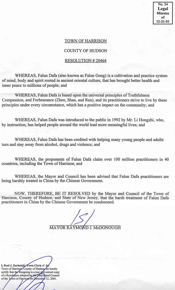 New-Jersey : Le Maire et le Conseil Municipal de Harrison ont adopté une résolution condamnant le traitement brutal des pratiquants de Falun Dafa en Chine par le Gouvernement Chinois