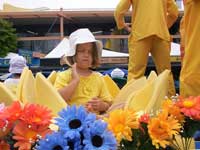 Le char Falun Dafa est trés coloré : Les enfants méditent en position du lotus pendant que quatre pratiquants font une démonstration des quatres premiers exercices du Falun Gong.