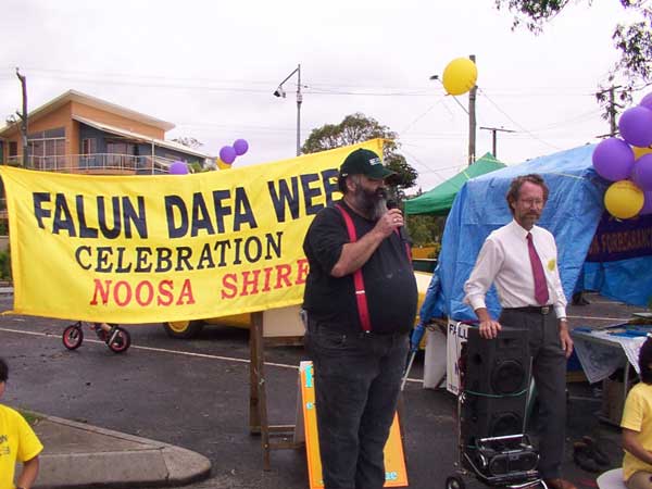 Bob Abbot le Maire de Noosa Shire parle à la foule exprimant son soutien à l'inauguration de la première semaine Falun Dafa australienne.