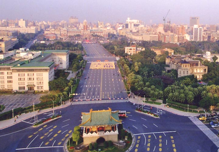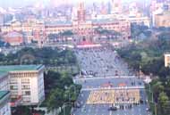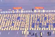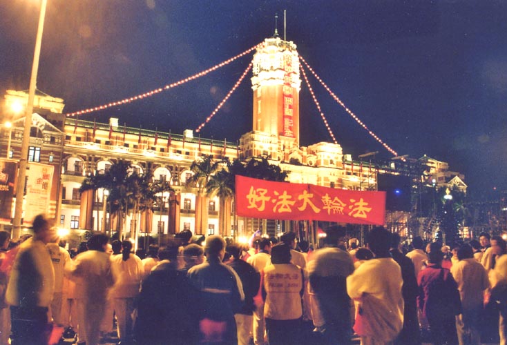 Les pratiquants Taïwanais assistent au levé des drapeaux et forment les caractères "Le Fa rectifie le monde humain"