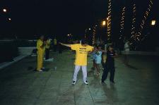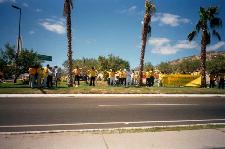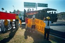 Il était clair que le gouvernement chinois avait exercé ses pressions juste avant l’arrivée de Jiang, car trois bus arrivèrent pour cacher en partie de sa vue les pratiquants. Quelques uns réussirent à passer devant les bus, cependant, et étaient en pleine ligne de mire du cortège.