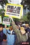 Se promenant avec 7 affiches exposants les crimes de l’Article 23 sur leurs dos, les représentants des Unions des Travailleurs défilent vers le bureau du gouvernement de Hong Kong, protestant que l’Article 23 menaces sérieusement les intérêts des travailleurs.