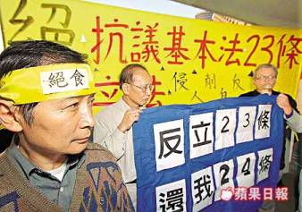 Le Apple Daily a rapporté le 13 décembre que l'Association des Journaliste de Hong Kong a invité ses membres à demander à des amis de participer à la démonstration contre la législation de l'Article 23 tenu au parc Victoria dimanche, et dit qu’il est temps d’agir. L'Association Internationale d'Éducation a également invité ses professeurs à s’impliquer. Huit professeurs du niveau collégial ont rencontré Regina Ip Lau Suk-yee, Secrétaire de la Sécurité, et ils ont rassemblé plus de 500 signatures de professeurs du niveau collégial pour s'opposer à la législation. Beaucoup d'organismes ont également demandé à leurs membres de participer à la campagne. Cinq résidents locaux ont commencé une grève de la faim de 48 heures hier dans le froid de la soirée afin de protester la tentative des autorités de Hong Kong de piétiner sur les droits de l'Homme avec la nouvelle législation.