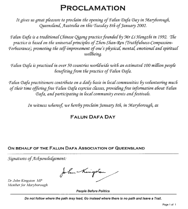 Australie : Le Député du Queensland, Dr. John Kingston, proclame le 8 janvier journée Falun Dafa à Maryborough