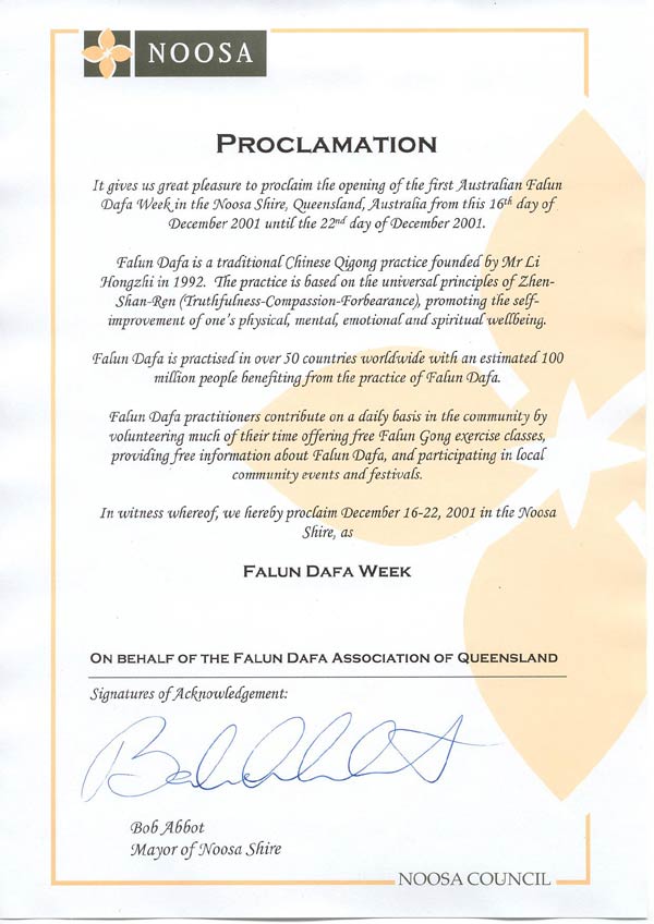 Australie : Le Maire de la ville de Noosa Shire, Mr. Bob Abbot, proclame la semaine du 16 au 22 décembre semaine Falun Dafa à Noosa Shire