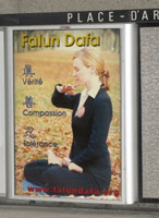 | Une publicité du Falun Gong, dans la station de métro Place d'Armes, près du Quartier chinois. | |