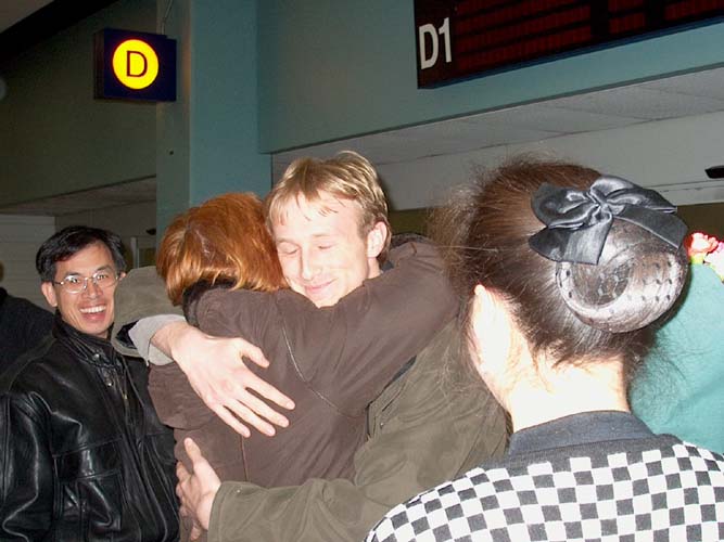 Plus de 60 pratiquants de Toronto attendaient à l'aéroport de Toronto pour accueillir Jason. La mère et la soeur de Jason sont aussi allées à l'aéroport. Dans ce hall d'aéroport famillier, c'est la quatrième fois que des pratiquants de Toronto ont accueillit des pratiquants occidentaux qui sont allées au Square Tiananmen pour valider le Dafa au monde entier. Ce sont les pratiquants Joel Chipkar, Zenon, Connie Chipkar et Jason E. Loftus.