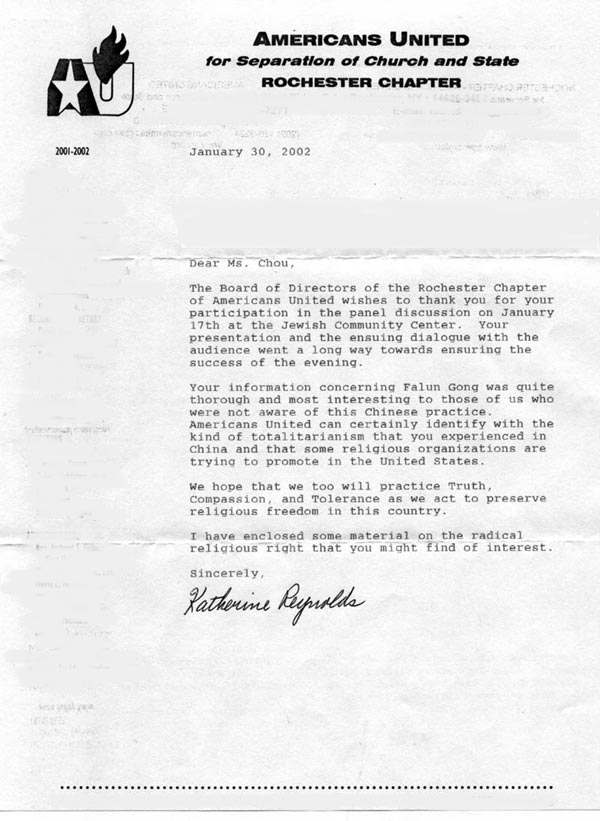 Americans United for Separation of Church and State Rochester Chapter répond aux pratiquants du Gong