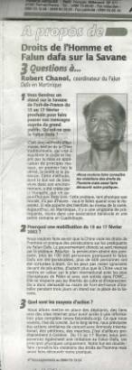 [Site Minghui] Le 5 février 2002, "France-Antilles", un journal local de Martinique (Département français d'outre-mer) a publié un article sur une interview de Mr. Robert CHANOL, un élève martiniquais du Falun Gong. L'article est ci-après.