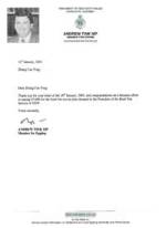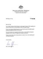 Lettres à Zhang Cui Ying des Membres du Parlement Australien concernant son exposition à Sydney et un don en argent au fond des Feux de brousses. 1. Lettre de ANDREW TINK MP