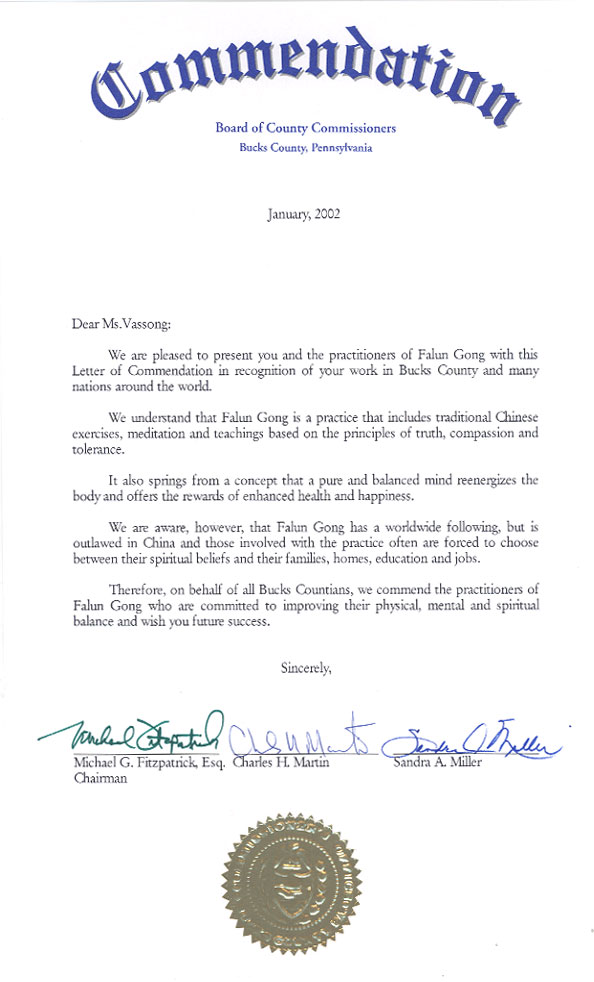 Le comté de Bucks en Pennsylvanie récompense les pratiquants du Falun Gong