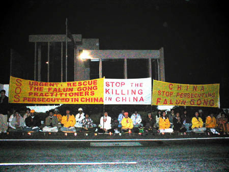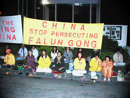 Des pratiquants néo-zélandais envoient des pensées droites avec force devant le Consulat de Chine à Auckland