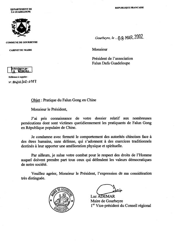 Un maire français de la Guadeloupe condamne avec fermeté la persécution de pratiquants sans défense par les autorités Chinoises