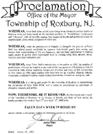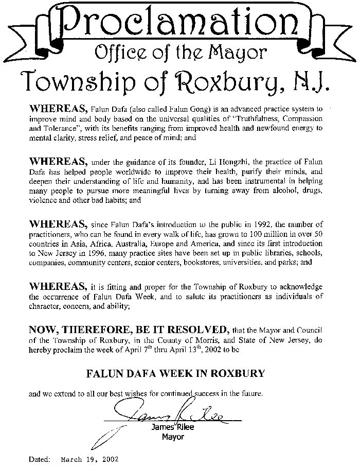 New-Jersey : Le Maire et le Conseil de la municipalité de Roxbury proclament la semaine du 7 au 13 avril 2002, la semaine Falun Dafa