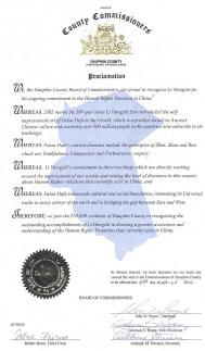Les membres de la commission du comité du Dauphin de Harrisburg, en Pennsylvanie on fait une proclamation reconnaissant Maître Li Hongzhi