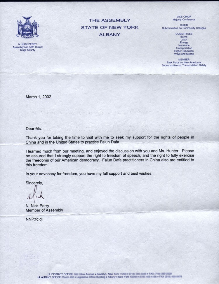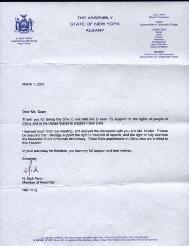 Un membre de l'Assemblée de l'État de New-York : "Dans votre plaidoyer pour le liberté, vous avez mon soutien absolu et mes meilleurs voeux."