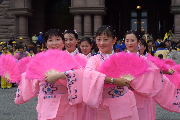 du Dafa de Toronto font une dance avec des éventails.