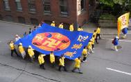 de Falun Dafa portent un grand emblème de Falun