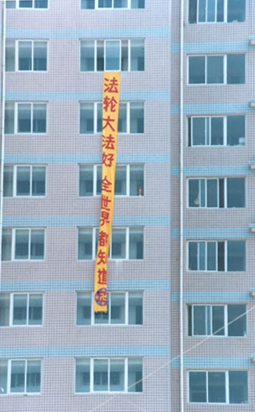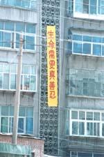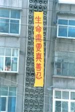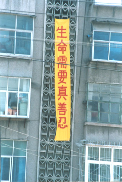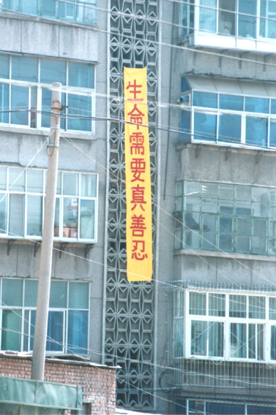 Des banderolles clarifiant la vérité accrochées à de grands immeubles dans le Nord de la Chine le 19 mai 2002 (Photos)