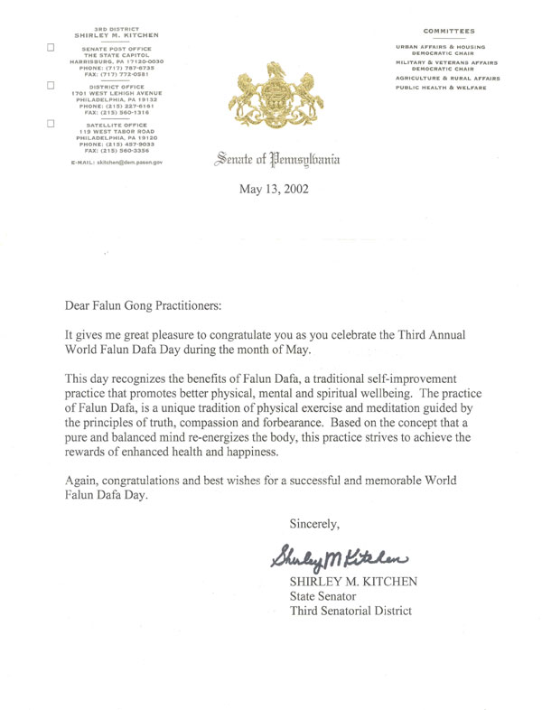 Lettre de félicitations de la Sénatrice de l'État de Pennsylvanie pour la Journée Mondiale du Falun Dafa, Pennsylvanie [le 13 Mai 2002]