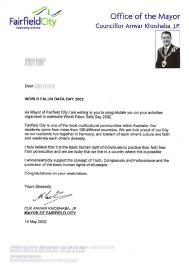 Lettre de félicitations au pratiquants pour la Célébration de la Journée Mondiale du Falun Dafa, le Maire de la ville de Fairfield, en Australie [le 14 Mai 2002]