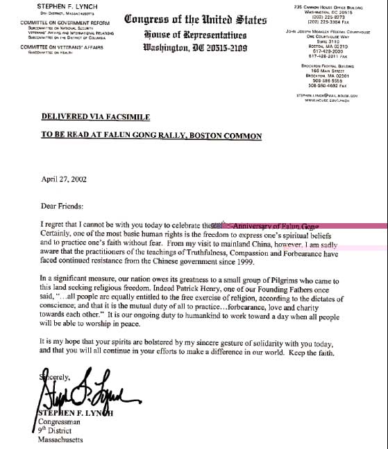 Lettre du Membre du Congrès Stephen Lynch exprimant sa solidarité avec le Falun Gong et son soutien à la liberté de croyance