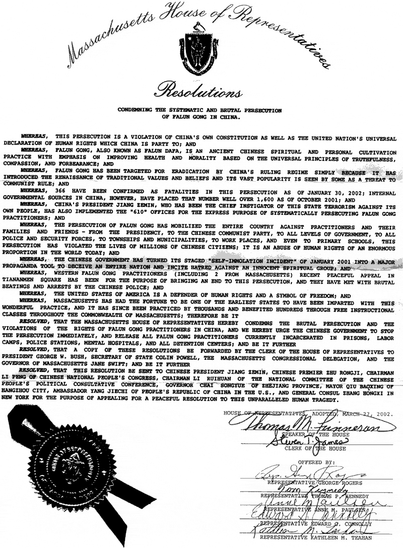 La Chambre des Représentants du Massachusetts adopte une résolution condamnant la persécution brutale et systématique du Falun Gong en Chine