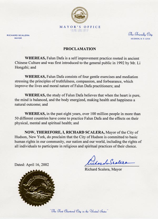 Le Maire de la ville de Hudson, dans l'état de New-York a fait une proclamation soutenant les droits de l'Homme des pratiquants du Falun Gong