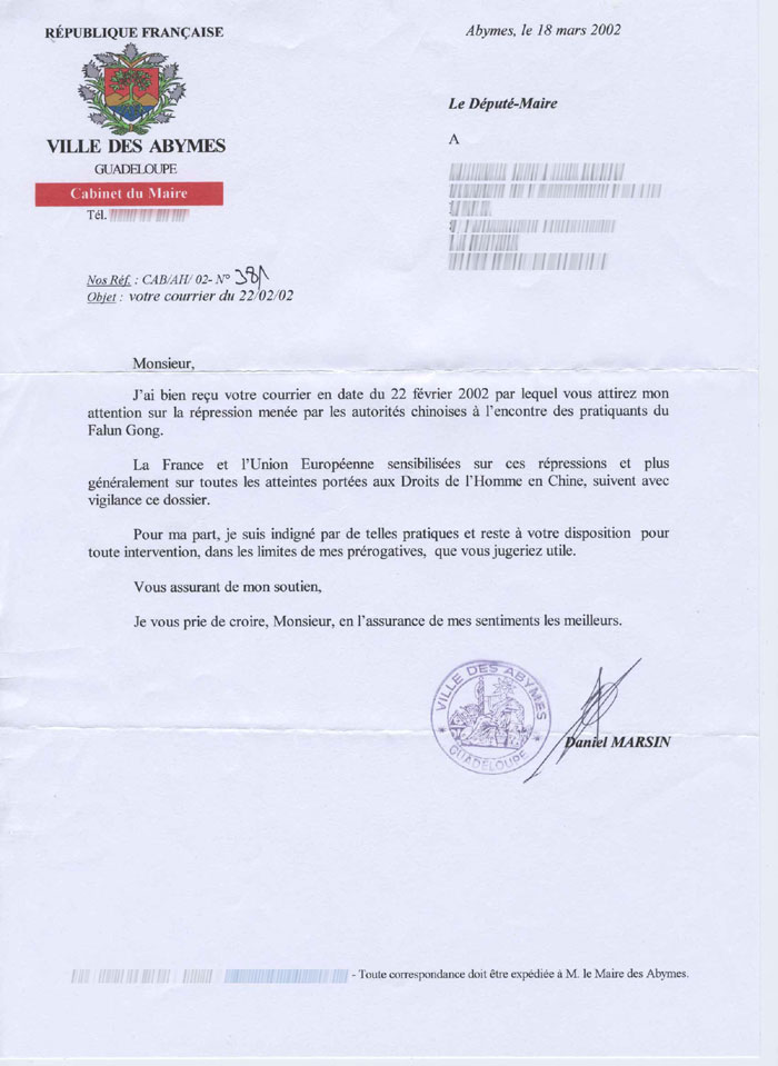 Lettre soutenant les droits de l'homme des pratiquants du Falun Gong de la part de la ville de Abymes, en Guadeloupe, France