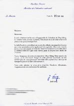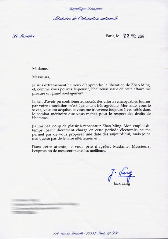 Lettre du Ministre Français de l'Éducation suite à la libération de Zhao Ming