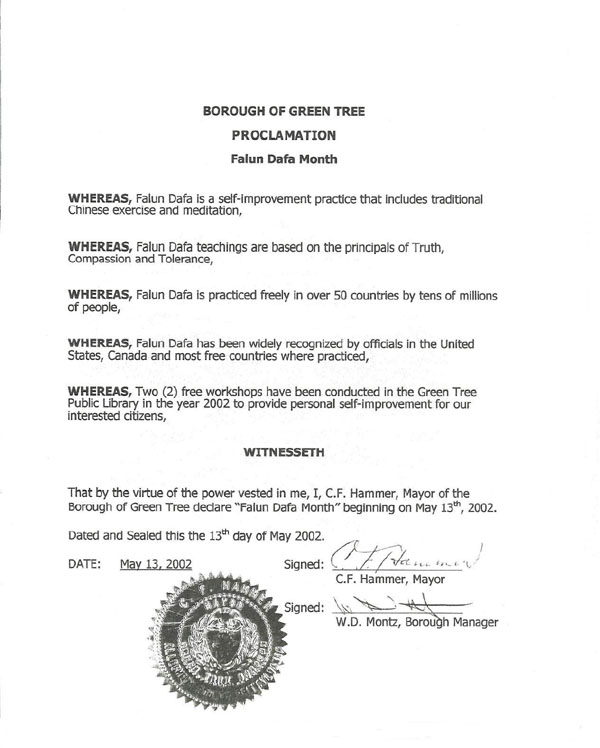 Proclamation du mois Falun Dafa, Municipalité de Green Tree, Pennsylvanie [le 13 Mai 2002]