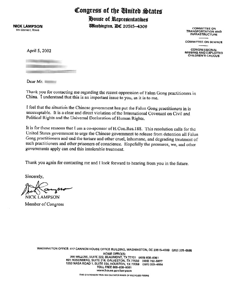 Lettre de soutien de Nick Lampson, membre du Congrès des États-Unis, Washington, DC [5 avril 2002]