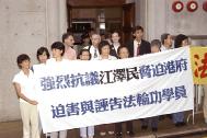 Les pratiquants sous accusations au procès tenant des banderoles en sortant de la Cour, le 6 août. Sur la banderole on peut y lire : " Protestant fortement le régime de Jiang qui contraint les autorités de Hong Kong à persécuter et à faussement accuser les pratiquants du Falun Gong". |