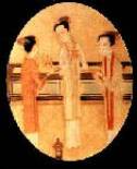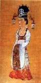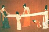 gauche: femme avec une barrette à cheveux décorée de fleurs; dynastie Tang Au centre: femmes en train de teindre des tissus; dynastie Tang A droite: femme noble en costume court; dynastie Tang |