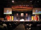 Sur les côtés de la salle de conférence principale on pouvait voir d'immenses banderoles sur lesquelles on lisait: