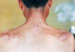 A l'épaule droite, cicatrice d'approximativement 9cm de long, 4cm de large et 1cm d'épaisseur