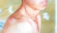 Une fois, le chef de l'équipe moyenne a ordonné aux criminels de me torturer. D’abord, ils m'ont sévèrement battu avec une ceinture, puis ils m’ont demandé si je continuerais à pratiquer. Quand j'ai répondu, "Oui," ils m'ont écrasé avec un panier plein de pierres pesé approximativement 100 kilogrammes. Après que j'aie été poussé par terre, ils ont frotté le panier contre mon cou et mon épaule, faisant saigner immédiatement ma peau et fendue. Ceci s'est produit au milieu de l'été, et parce qu'ils n'ont pas traité mes blessures, mes blessures se sont putréfiées. Quelques jours plus tard, un collaborateur et plusieurs criminels m'ont traîné dans la salle d'eau. Ils m'ont nourri de force avec une drogue inconnue, affirmant qu’ils essayaient de traiter mes blessures. Je leur ai dit, "Vous m'avez torturé à ce point, comment pouvez vous même parler de me donner un traitement?" Ils ont utilisé une brosse à dents pour répandre les drogues, l'alcool, et le vinaigre sur mes blessures. C’était extrêmement cruel. Seulement quelques mois plus tard mes blessures ont commencé lentement à guérir. Après qu'elles aient guéri, il restaient encore quelques lacérations qui ressemblent à une tumeur. À ce jour, je sens souvent la douleur pointue et la démangeaison à ces blessures.