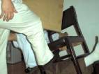 Les malfaiteurs étirent les bras du pratiquant et menottent ses mains séparément à des objets fixes (tel que des montants de lit). Le pratiquant est forcé de s’asseoir sur le sol de béton avec les pieds placés sur une chaise et les jambes soulevées. Les malfaiteurs placent par la suite une chaise sur les genoux du pratiquant et se dressent dessus, ce qui cause une douleur extrêmement atroce.