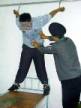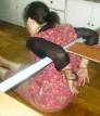 En octobre 2002, Mme Kang Aimin pratiquante de Falun Dafa refusé de signer la déclaration, ainsi les policiers Li Xiujin, Zhou Jiali, Sun Limin et d'autres l'ont menottée dans cette position. Ils ont également inséré une image de fondateur de Falun Dafa à l'intérieur de son pantalon pour l'humilier et pour diffamer sa foi. Mme Kang était tellement en douleur que la sueur lui tombait de la tête, mais après une heure, elle refusait toujours de signer la déclaration. La police plus tard l'a mise dans cette position, une deuxième fois, où elle a perdu connaissance.