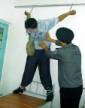 Durant l’investigation du cas d’interception du signal de télévision, la police du commissariat de Qianjin de la ville de Jiamusi a kidnappé un pratiquant de Falun Dafa et l’a torturé en le suspendant par les menottes. Plusieurs policiers ont soulevé ce pratiquant dans les airs et l'ont menotté à une barre en métal qu'il ne pouvait pas atteindre debout. Ils l’ont alors lâché ce qui a transféré tout le poids de son corps sur ses poignets menottés. La sensation suivante, selon le pratiquant, fut un sentiment de séparation des tendons du pouce jusqu’aux poignets. Le pratiquant a alors essayé de rallonger ses jambes pour soutenir son corps et pour diminuer la douleur dans les bras, mais la police lui a tout simplement séparé les jambes pour les attacher à l’armature du lit. Après seulement deux ou trois minutes de suspension dans les airs sous tout son poids corporel, reposant totalement sur ses bras, le pratiquant a perdu toute sensation dans les deux bras. Mais plutôt que de le libérer, la police a attaché un poids lourd en fer autour de son cou et l’a ainsi saisi par la cage thoracique pour le balancer ça et là pour augmenter la pression et la douleur dans ses bras.