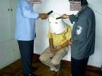 En mai 2002, le pratiquant de Dafa M. Hou Zhiqiang a été kidnappé et emmené au centre de détention par des policiers déguisés en pratiquants. Pendant sa détention, Hou a été interrogé bien des fois et même torturé. Un seau de métal lui a été enfoncé sur la tête et plusieurs policiers frappaient le seau avec des matraques de bois ce qui cause des bruits et des vibrations assourdissants. Après avoir subi cette torture plusieurs fois, M. Hou souffrait souvent de spasmes dans tout le corps pendant le sommeil