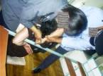 Puisqu'une pratiquante a refusé d'écrire la déclaration de dénonciation au Falun Dafa, policière Wang Yadong l'a dévêtue et l’a laissé avec seulement ses sous-vêtements. Elle l’a alors menottée dans cette position. Et pendant que la pratiquante transpirait énormément sous la douleur intolérable, Wang a commencé à lui frapper la tête