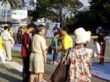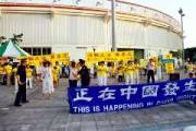 Dans l’après-midi, les pratiquants de Falun Gong ont continué à promouvoir le Dafa autour du stade. « L’exposition contre la torture » était montée le long de la rue, et plusieurs résidents étaient choqués de voir les tortures cruelles qui se passent actuellement en Chine.
