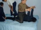 On force des pratiquants de Falun Gong à s'accroupir sur le sol avec leurs mains derrière le dos. Les prisonniers et les policiers battent violemment les pratiquants de Falun Gong sur la tête et sur le dos avec des tabourets et des bancs. Si les pratiquants ne leurs obéissent pas, ils les torturent avec des méthodes encore plus cruelles.