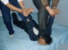 Deux prisonniers forcent le pratiquant au sol. Tandis qu'un des prisonniers lui « casse » le bras, l'autre place son pied sur les fesses du pratiquant, lui saisit la jambe et se sert de son épaule pour forcer de toutes ses forces la jambe du pratiquant vers le haut, causant une douleur extrême dans les hanches.