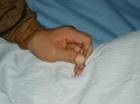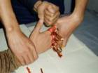 Les gardiens et les prisonniers mettent des objets durs (bâtons de bois, tiges en métal, etc..) entre les doigts du pratiquant, puis tordent les doigts, écrasent ou frappent durement la main du pratiquant avec leur poing tout en serrant fortement l’extrémité des doigts. Les doigts sont blessés immédiatement, causant une douleur extrême. Les doigts de certains pratiquants de Falun Gong ont des séquelles permanentes à la suite de cette torture. Les blessures qui résultent de cette torture abîment les os et les mains du pratiquant sont transformées en une bouillie de chair et de sang.